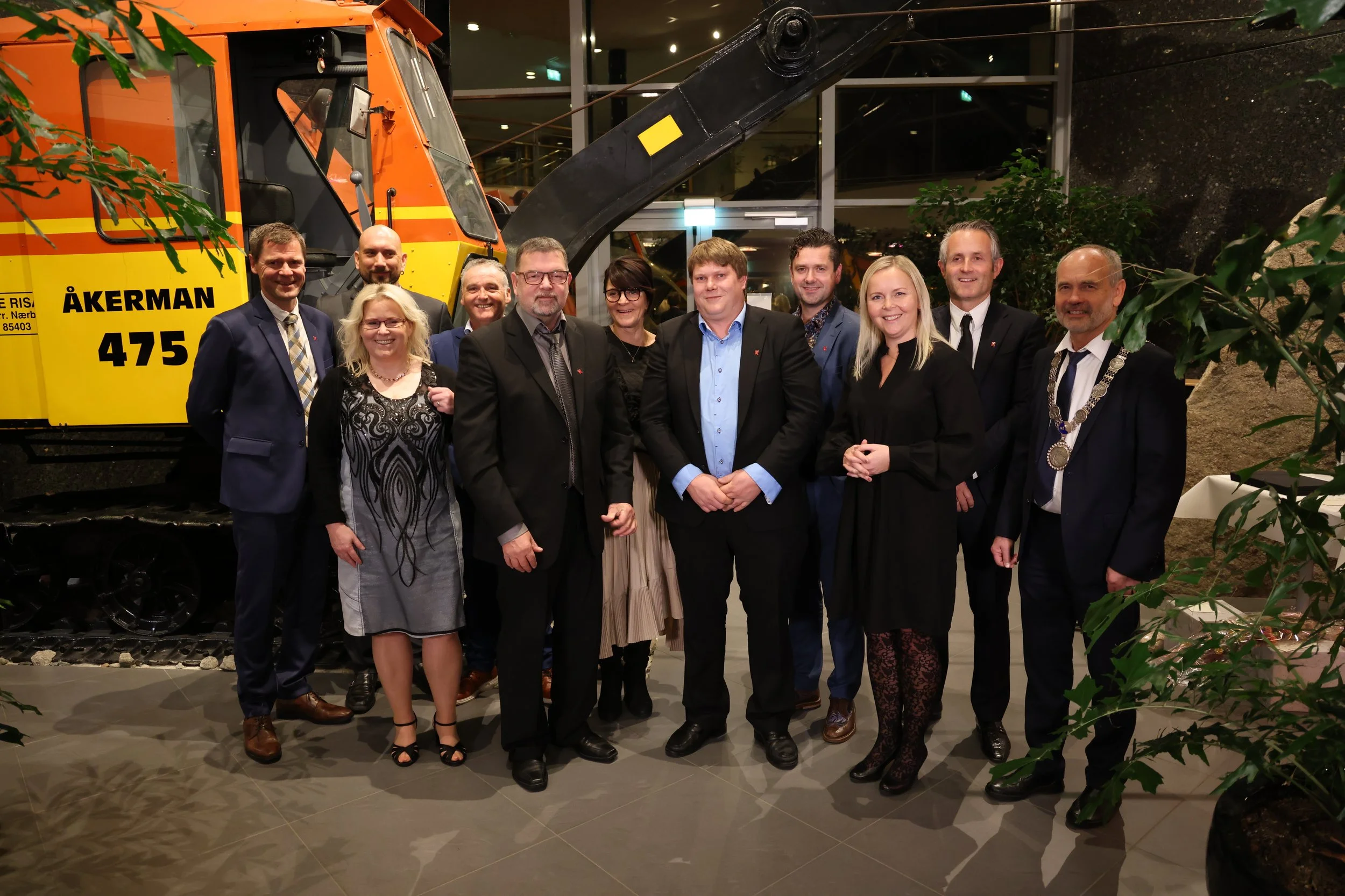 F.v. Ole Sjølyst, Morten Horpestad, Marianne Hestås, Kurt Varhaug, Magne Odland, Personalsjef Torill Sigurdsen, Arnt Ole Åmlid, Kjetil Friestad, Mari K. Rake, Daglig leder Bjørn Risa og Ordfører Jonas Skrettingland