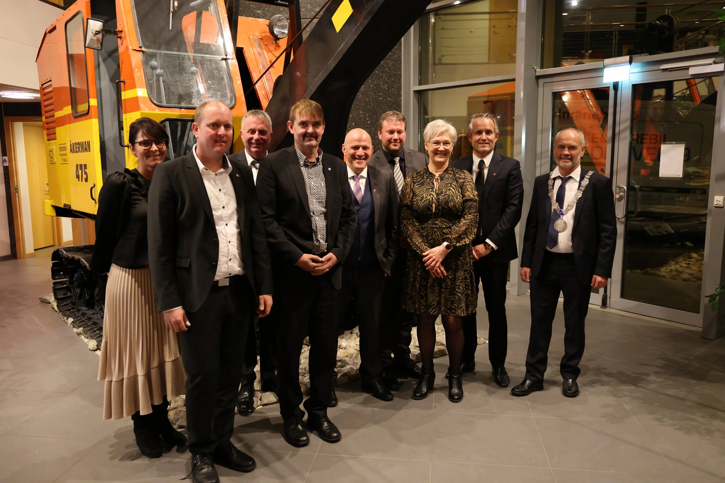 F.v. Personalsjef Torill Sigurdsen, Leif Jakob Træland, Per Odd Hatteland, Steinar Kvinlaug, Jan Emil Reinertsen, Geir Braut, Nina S. Hansen, Daglig leder Bjørn Risa og Ordfører Jonas Skrettingland