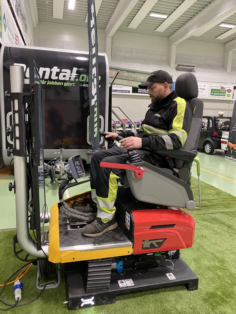 Vi har med oss messehenger og litt forskjellig utstyr bla. en Volvo 15 tonner og gravemaskin-simulatoren er alltid en hit på messer.