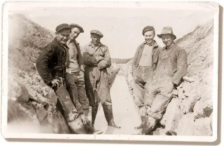 Like etter krigen kjøpte brødrene den første gravemaskinen. Maskinen som ble kalt «Jarnspøkelse» veide 43 tonn og ble kjøpt for 22000 kroner. Det var ingen liten sum på den tiden. På vei hjem fra Soma der den ble kjøpt, ble hele maskinen slukt av Børaholsmyra til stor fortvilelse for brødrene. Men med ekta jærsk pågangsmot fikk de etter tre dagers slit maskinen opp og renset for mudder og gjørme og klar for innsats.